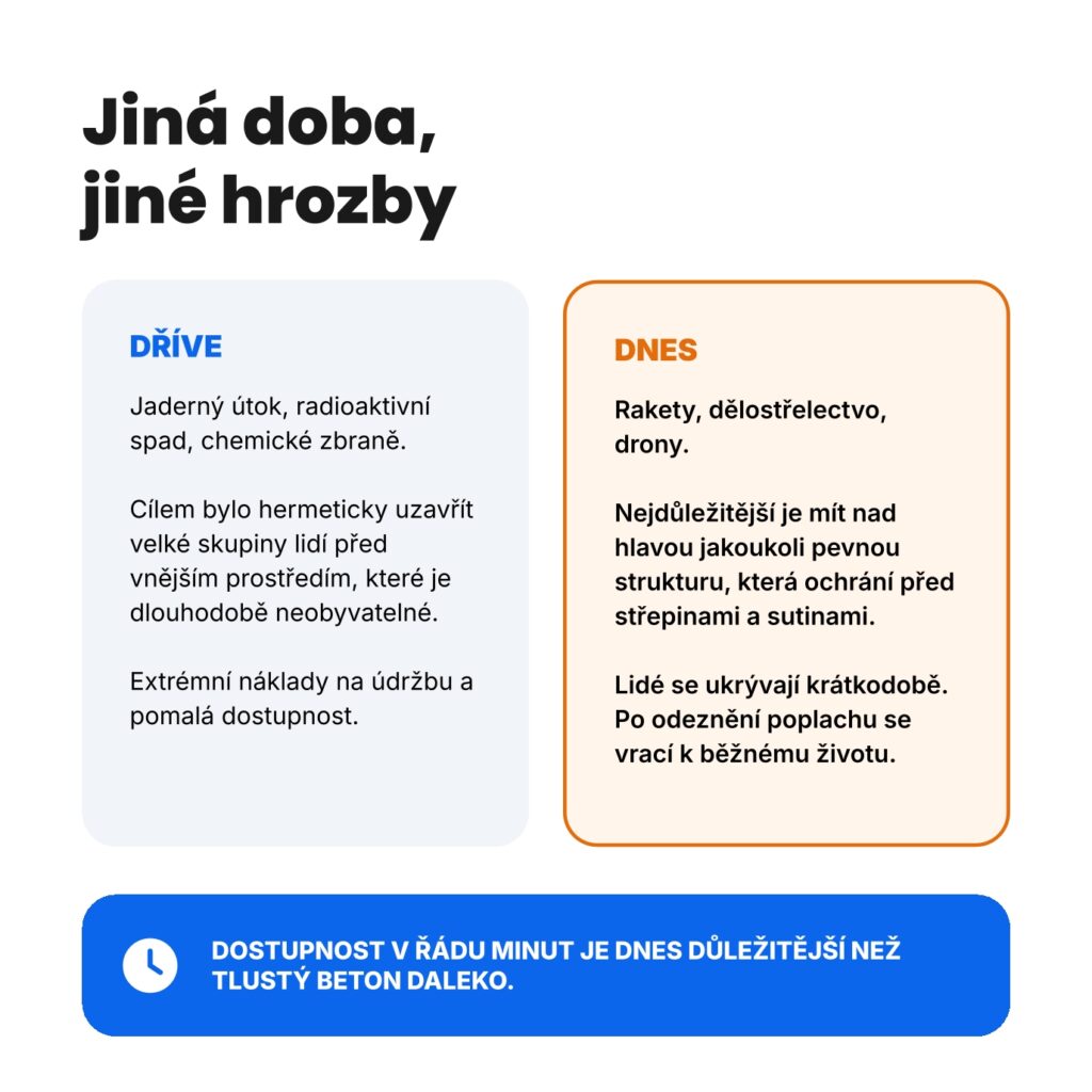 Zatímco dříve byl prioritou tlustý beton proti jadernému útoku, dnes čelíme jiným rizikům (rakety, drony, střepiny).